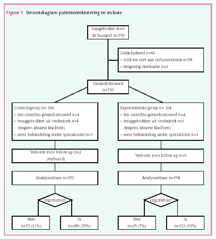 De inclusieperiode startte op 1 maart 1999 en eindigde op 31 december 2000. Van de 172 benaderde huisartsen namen er 133 (77%) deel aan het onderzoek. Gezamenlijk verwezen zij 790 patiënten met atypische klachten van pijn op de borst, mogelijk coronairlijden of een vermoeden van stabiele angina pectoris. In het stroomdiagram in figuur 1 zijn gegevens over patiëntenrekrutering en inclusie opgenomen. Van de patiënten konden er 711 worden geanalyseerd: 358 patiënten waren gerandomiseerd naar de experimentele groep en 353 naar de controlegroep. In de controlegroep besloot de cardioloog 280 maal (79%) een fietsergometrisch onderzoek aan te vragen. Bij 73 controlepatiënten (21%) werd van dit onderzoek afgezien. Deze patiënten werden verwezen voor nucleair onderzoek of werden rechtstreeks gekatheteriseerd. Van de experimentele groep bezochten 354 patiënten de functieafdeling; 4 patiënten werden eerder gezien in verband met een vermoeden van een acuut coronair syndroom. Van de 354 patiënten werd als gepland bij 333 inspanningselektrocardiografie uitgevoerd. Bij de 21 andere patiënten werd op de functieafdeling besloten hiervan af te zien. De belangrijkste redenen daarvoor waren: afwijkend elektrocardiogram in rust en hypertensie. Bij 29% van de 354 patiënten uit de experimentele groep, die zich hadden gemeld voor inspanningselektrocardiografie concludeerde de adviserend cardioloog dat verwijzing naar het cardiologisch spreekuur de beste optie was. De andere patiënten werden terugverwezen naar de huisarts met een advies voor al of niet verder (be)handelen. Wat betreft demografische en klinische kenmerken waren er tussen beide groepen geen significante verschillen ( tabel 1). De doorlooptijden waren het kortst in de experimentele groep ( tabel 2). Ook bij coronairlijden was de diagnosetijd in de experimentele groep significant korter (13,3 dagen).