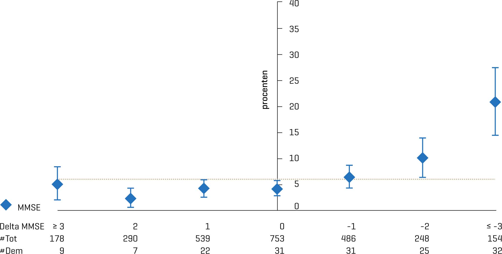 Aan de linkerkant van de x-as staan deelnemers met een verbeterde MMSE-score, aan de rechterkant deelnemers die na twee jaar een verslechterde score hebben. De stippellijn geeft het gemiddelde risico op dementie aan (5,9%). #Tot = totaal aantal deelnemers in deze categorie; #Dem = voor het aantal gevallen van dementie