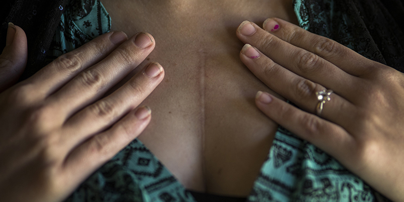 Na enkele weken ziekenhuisopname wordt de patiënte ontslagen met intraveneuze antibiotica thuis. In de eerste nacht thuis ontwikkelt ze pijn op de borst. Bij de spoedvisite in de ochtend is er een bloeddruk van 70/40 en collabeert patiënte enkele malen bij overeindkomen. In het ziekenhuis wordt een late hartamponnade geconstateerd die zij door resternotomie ternauwernood overleeft.