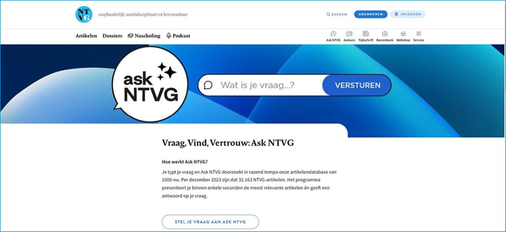 Het Nederlands Tijdschrift voor Geneeskunde (NTVG) heeft een AI-toepassing gemaakt waarmee artsen eenvoudiger de website kunnen doorzoeken bij klinische vragen. Als je rekening houdt met de beperkingen van deze geavanceerde zoekmachine biedt dit zeker kansen voor de dagelijkse praktijk. Ask NTVG is daarom een interessante, moderne innovatie van een van de oudste medische tijdschriften in Nederland.