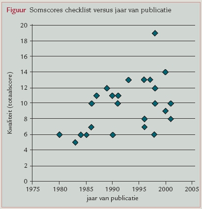 In totaal werden 30 relevante artikelen geselecteerd waarvan er 5 werden uitgesloten. De redenen hiervoor waren: geen controlegroep (n=3), afwijkende onderzoeksopzet (n=1); in één RCT werd de effectiviteit van manipulatie bestudeerd (corticosteroïdinjectie bleek co-interventie). In totaal bleken er 25 RCT's11235geschikt. De mediane methodologische score was 9,6, ofwel 46% van de maximaal haalbare score. In de figuur wordt de associatie weergegeven tussen jaar van publicatie en methodologische score. Het blijkt dat de kwaliteit van het onderzoek in de afgelopen 20 jaar geleidelijk is toegenomen. Slechts 5 RCT's behalen minimaal 13 punten,115283135waarvan 41152831tevens een goede score voor interne validiteit krijgen. Vier andere RCT's17212426behalen wel een goede score voor validiteit (7 punten), maar de totaalscore bleek net onvoldoende (11 of 12 punten). De tekortkomingen betreffen meestal aspecten van power en generaliseerbaarheid ( tabel 2): de powerberekening (item P2, gebaseerd op een vooraf gedefinieerd klinisch relevant verschil) is zelden beschreven; de groepsgrootte is klein (P1); niet alle geschikte patiënten komen in aanmerking voor randomisatie (G2); een intention-to-treatanalyse wordt meestal niet uitgevoerd (V9) en de generaliseerbaarheid van resultaten naar de huisartsenpraktijk is beperkt (G6).