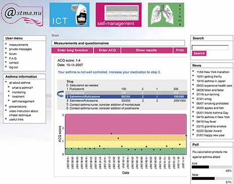 - 12.↲Van der Meer V, Van Stel HF, Detmar SB, Otten W, Sterk PJ, Sont JK. Internet-based self-management offers an opportunity to achieve better asthma control in adolescents. Chest 2007;132:112-9.