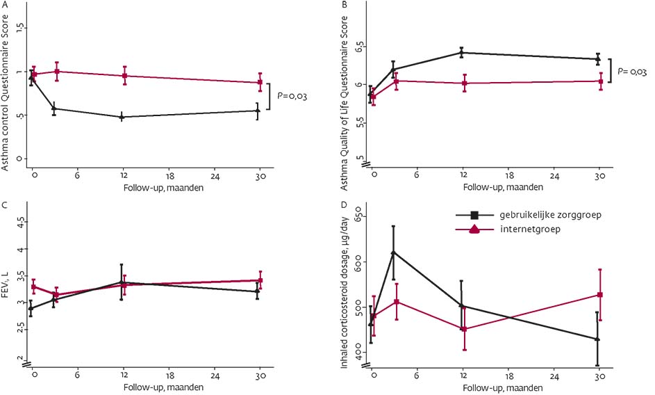 Zelfmanagementondersteuning via internet verbetert de astmagerelateerde kwaliteit van leven, de astmacontrole, de longfunctie en het aantal symptoomvrije dagen, vergeleken met de gebruikelijke zorg.