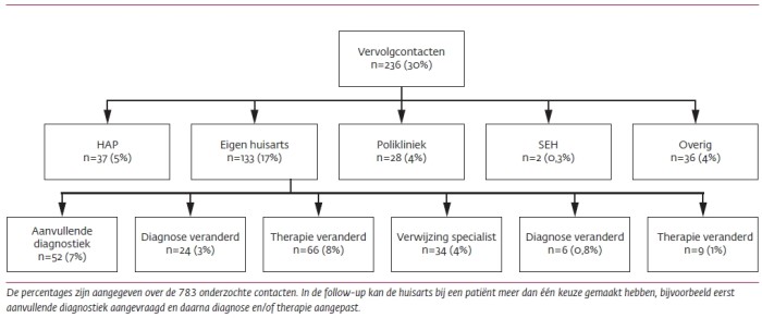 follow-up: vervolgcontacten, aanvullende diagnostiek, verandering in diagnose of beleid door huisarts of specialist, eventuele complicaties.