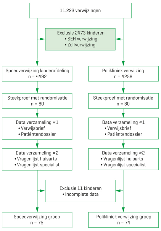 Na toelichting door schriftelijke en verbale presentaties over het onderzoeksprotocol en de onderzoeksopzet zijn alle kinderartsen van de vakgroep kindergeneeskunde in het Elisabeth-TweeSteden Ziekenhuis en alle huisartsen in de regio uitgenodigd om deel te nemen. Alle kinderen in de leeftijdscategorie 1 maand tot en met 16 jaar oud die tijdens de onderzoeksperiode door de huisarts als nieuwe patiënt werden verwezen naar de afdeling kindergeneeskunde in het Elisabeth-TweeSteden Ziekenhuis, kwamen in aanmerking voor inclusie [figuur].