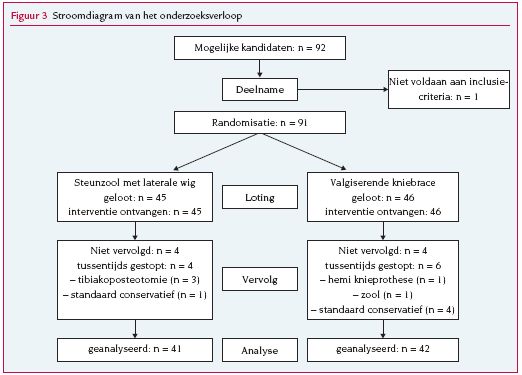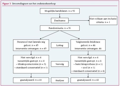 Van januari 2006 tot september 2007 randomiseerden we 92 opeenvolgende patiënten. Een patiënt met mediale gonartrose en klinisch een varusbeen sloten we uit van deelname in verband met een valgusbeenas op de langebeenopname. Dit leidde tot een groep van 91 patiënten. Tabel 1 laat de karakteristieken zien van de patiëntenpopulatie. Er zaten 45 patiënten in de zoolgroep en 46 patiënten in de bracegroep; 4 patiënten in de zoolgroep en 4 patiënten in de bracegroep konden we niet vervolgen. Vier patiënten in de zoolgroep en 6 patiënten in de bracegroep veranderden gedurende de 6 maanden van behandeling (zowel conservatief als chirugisch). De belangrijkste reden was dat de behandeling geen effect sorteerde (4 van de 4 patiënten in de zoolgroep en 3 van de 6 patiënten in de bracegroep). Andere redenen waren slecht passende braces of zolen, vermindering van de klachten en toename van het crepiteren van de knie. Figuur 3 vat het onderzoeksverloop samen. In beide groepen verbeterden de scores voor pijn en WOMAC-functie ten opzichte van de nulmeting (tabel 2), maar het verschil tussen beide groepen was niet significant. Voor pijn was het verschil tussen beide groepen in VAS 0,06 (95%-BI –1,05-0,93; effectgrootte 0,03) en voor WOMAC-functiescores 0,15 (95%-BI –7,95-7,65, effectgrootte 0,008). De intention-to-treat- en per-protocolanalyses lieten geen verschil zien tussen beide groepen in percentage patiënten (13% versus 20% en 14% versus 18%) die reageerden op de behandeling (≥ 20% verbetering van de pijn en functie van de knie). Het varusalignement, gemeten met behulp van de HKE-hoek, was voor de zoolgroep op de nulmeting 6,9° (sd 3,6°) en bij het dragen van de steunzool 6,9° (sd 4,1°). De gemiddelde HKE-hoek voor de bracegroep zonder de brace was 7,0° (sd 3,6°) en met de brace 6,7° (sd 3,2°). De standsverandering van het been door het dragen van de zool of de brace was gelijk in beide groepen (–0,22; 95%-BI –0,68 - 0,25, effectgrootte 0,22). De patiënten droegen de steunzool met laterale wigschoring significant (p = 0,006) langer (57,8 (sd 28,8) uur per week), dan de kniebrace (38,8 (sd 32,2) uur per week). Een subgroepanalyse gestratificeerd voor patiënten met milde varusgonartrose (K-L-graad 1) liet voor de zoolgroep een bijna significant (p = 0,068) hoger percentage patiënten zien dat meer dan 20% verbeterde op pijn en functie in vergelijking met de bracegroep (46% versus 15%). Huidirritaties zagen we in de bracegroep het meest (n = 10) en 2 patiënten kregen blaren, wat zonder gevolgen bleef. Zeven patiënten vonden de brace niet goed passen. Vijf patiënten konden de steunzool niet in verschillende schoenen dragen.
