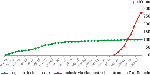 De nieuwe inclusieroute bleek vanaf het begin goed te werken. Tussen september 2021 en mei 2022 werden 1780 D-dimeerbepalingen aangevraagd en daarvan betroffen er 1157 (65%) een vermoeden van longembolie. Voor 581 patiënten (50%) uit die groep vulde de huisarts de YEARS-vragen in en uiteindelijk gaven 270 patiënten (46%) toestemming voor datacollectie. De inclusiesnelheid was gemiddeld 34 patiënten per maand, het tienvoudige van de ‘reguliere’ inclusiemethode [figuur].