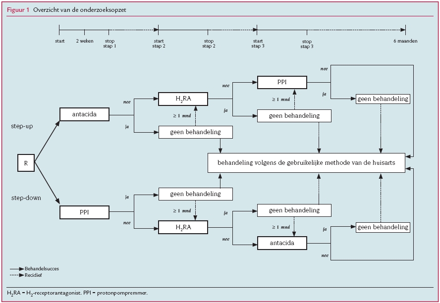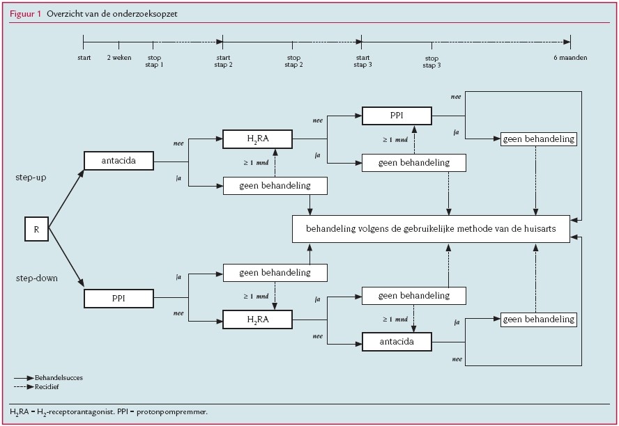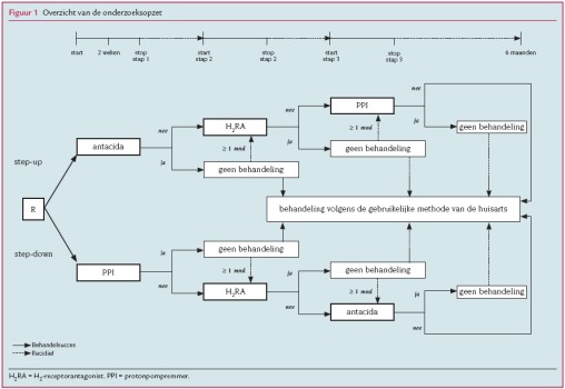 De huisartsen verrichtten de consulten op de gebruikelijke wijze en gaven zo nodig ook leefstijladviezen.10 Aanvullend kregen de patiënten informatie over het onderzoek. Patiënten die voor deelname in aanmerking kwamen, werden willekeurig toegewezen aan een step-up- of step-downbehandeling (figuur 1) door één van de identiek verpakte medicatiedoosjes te openen. Elk doosje bevatte reeds gerandomiseerde, afzonderlijk verpakte medicatiepakketjes voor elke behandelstap van vier weken. De patiënten, artsen en onderzoekers waren alle geblindeerd voor de toegewezen behandelingsstrategie tot zes maanden na randomisatie. De arts nam tijdens het inclusieconsult tevens bloed af, maakte een controleafspraak voor vier weken nadien en gaf aan de patiënt de medicatie van stap 1 mee plus een vragenlijst over symptomen en een over de kwaliteit van leven.161718 Patiënten kregen de instructie deze vragenlijsten in te vullen vóór aanvang van de behandeling en de controleafspraak af te zeggen als ze na vier weken klachtenvrij waren – tenzij een controleafspraak gebruikelijk was bij de betreffende huisarts. De patiënt ging alleen door naar de volgende behandelstap als de symptomen aanhielden of binnen vier weken na het beëindigen van een behandelstap terugkwamen. Kwamen de symptomen pas na meer dan vier weken terug, dan behandelde de huisarts zelf verder naar eigen inzicht. Patiënten mochten eerder doorgaan naar de volgende stap als hun symptomen verergerden of als er onaangename bijwerkingen optraden. De medicatiepakketjes bevatten, steeds voor een behandelstap van vier weken, een zuurneutraliserend of zuurremmend middel in toenemende (respectievelijk afnemende) potentie.5 De step-upgroep kreeg in stap 1 een antacidum viermaal daags (aluminiumoxide 200 mg/magnesiumhydroxide 400 mg), in stap 2 een H2-receptorantagonist tweemaal daags (ranitidine 150 mg), en in stap 3 een protonpompremmer éénmaal daags (pantoprazol 40 mg). De step-downgroep kreeg dezelfde pakketjes, met de medicatie in omgekeerde volgorde. Om de behandelingsstrategie te blinderen was aan de antacidumbehandeling een placebo protonpompremmer eenmaal daags toegevoegd, en aan de protonpompremmer een placebo antacidum viermaal daags. Ongebruikte medicatie werd geretourneerd.