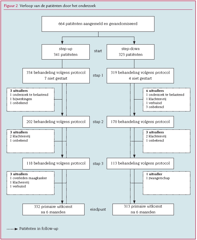 Van de 312 huisartsen die deelnamen, meldden er 150 (48%) in totaal 664 patiënten aan.12 Het verloop van de patiënten door het onderzoek is weergegeven in figuur 2. De step-upgroep telde 341 patiënten, van wie wij er na zes maanden 332 (97%) konden evalueren. De step-downgroep telde 323 patiënten, van wie er uiteindelijk 313 (97%) evalueerbaar waren. In totaal zijn negentien patiënten (negen uit de step-upgroep en tien uit de step-downgroep) voortijdig uitgevallen. De patiëntkenmerken op het moment van inclusie zijn weergegeven in tabel 1, de gegevens na zes maanden follow-up in tabel 2. In de step-upgroep kregen 139 (41%) patiënten alleen de stap-1-onderzoeksmedicatie. Zeven patiënten in deze groep startten in het geheel niet met de medicatie. Vierentachtig (25%) patiënten kregen zowel stap 1 als stap 2 en 118 (35%) patiënten kregen alle drie de behandelstappen. In de step-downgroep kregen 153 (47%) patiënten alleen stap 1, van wie er vier nooit gestart zijn. Zevenenvijftig (18%) patiënten kregen stap 1 en stap 2 en 113 (35%) patiënten kregen alle drie de behandelstappen. In de step-upgroep meldden 94 (28%) patiënten één of meer bijwerkingen (zie tabel 2), in de step-downgroep 93 (29%) patiënten. Daarbij ging het om (andere) dyspeptische klachten (step-upgroep 59 patiënten, step-downgroep 66 patiënten), diarree (step-upgroep 24, step-downgroep 15), constipatie (step-upgroep 15, step-downgroep 12), winderigheid (step-upgroep 12, step-downgroep 8), vieze of droge smaak (step-upgroep 4, step-downgroep 20), hoofdpijn (step-upgroep 5, step-downgroep 10), en huiduitslag of jeuk (step-upgroep 6, step-downgroep 7). Bij één deelnemer in de step-upgroep, een 60-jarige vrouw zonder alarmsymptomen, werd na 47 dagen maagkanker gediagnosticeerd en palliatieve behandeling gestart (figuur 2). De step-upbehandeling was bij haar na twaalf dagen in stap 1 en zeven dagen in stap 2 zonder resultaat gebleven.