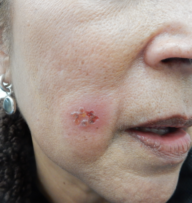 Een 60-jaar oude vrouw wordt door haar huisarts naar het spreekuur van de dermatoloog gestuurd vanwege een huidafwijking naast haar mondhoek. De patiënte heeft sinds 2 dagen een iets pijnlijke plek op de rechterwang. Daar heeft ze nog niet eerder last van gehad. Ook heeft ze nooit een koortslip gehad. Haar gezinsleden hebben geen last van huiduitslag. Op de rechterwang ziet haar huisarts een nummulaire plaque, die bestaat uit lenticulaire herpetiform gerangschikte vesikels met crustae en erytheem en oedeem rondom. Ze heeft geen algemene ziekteverschijnselen, zoals koorts. Haar voorgeschiedenis vermeldt geen bijzonderheden. Medicijnen gebruikt ze niet.