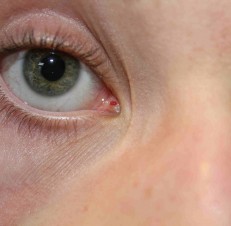Volgens moeder zit het er al jaren. Hij heeft geen visusklachten of pijn aan zijn oog.