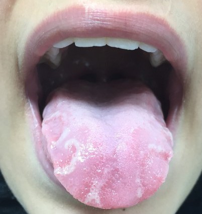 Een 17-jarig meisje heeft sinds enkele maanden last van een brandende tong, met name bij het eten van citrusvruchten. Behandeling met nystatine orale suspensie gaf geen verbetering.