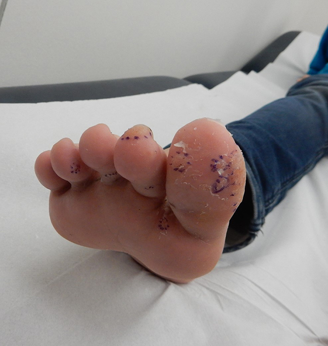 Een 15-jarige jongen komt in verband met jarenlang aanwezige ruwe en pijnlijke plekken op zijn tenen en vingers. Hij is reeds behandeld met cryotherapie, salicylzuurzalf 40% en thuis bijvijlen, en CO2-laser. Geen van de behandelingen was succesvol. Verder is de patiënt gezond. De kinderarts heeft hem gescreend en zag geen aanwijzingen voor een afweerstoornis.