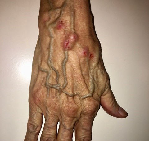 Een 92-jarige vrouw, met hypertensie, atriumfibrilleren en niet-rokend, presenteert zich sinds 1 jaar frequent op het spreekuur in verband met fors jeukende, erythemateuze, opengekrabde papels en nodi op beide onderarmen/handen en later ook op beide benen.