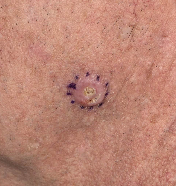 Een 65-jarige man komt bij de huisarts in verband met een snel (binnen 3 weken) gegroeide plek op zijn rechterwang. De plek is iets pijnlijk bij aanraken. De patiënt komt graag in de zon en heeft zijn jeugd in de tropen doorgebracht.